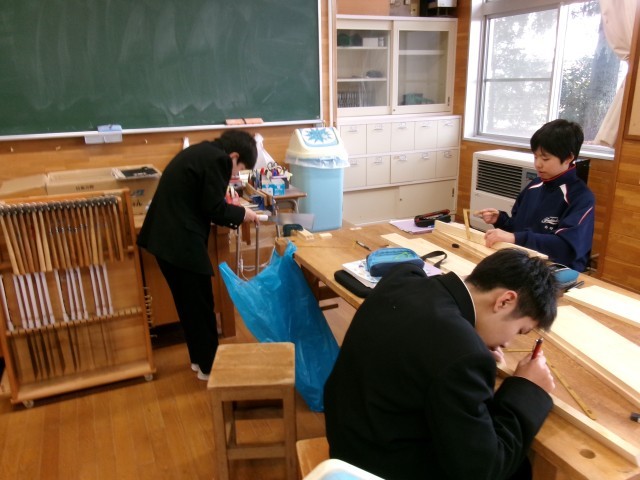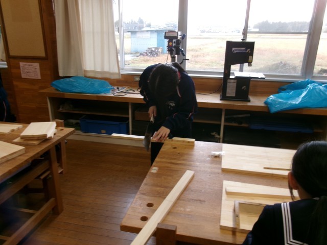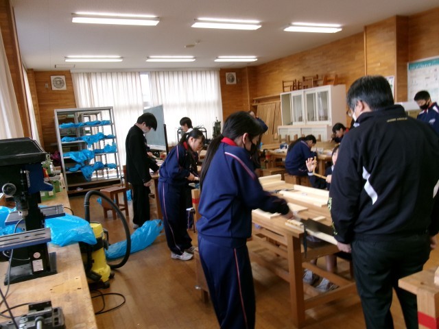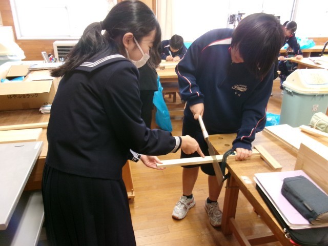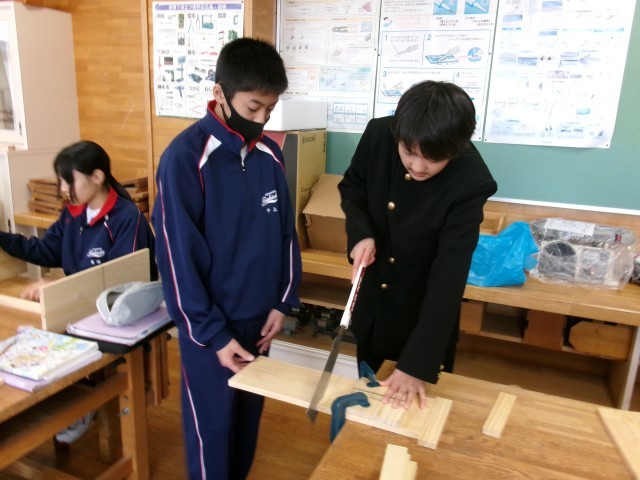 技術・家庭科の技術分野 木材加工の授業です。自分で書いた線のとおりに、のこぎりを使って切っていました。「のこぎりは、押すときよりも引くときに力を入れるように使うといいよ」との先生のアドバイスで上手に切っていました。
