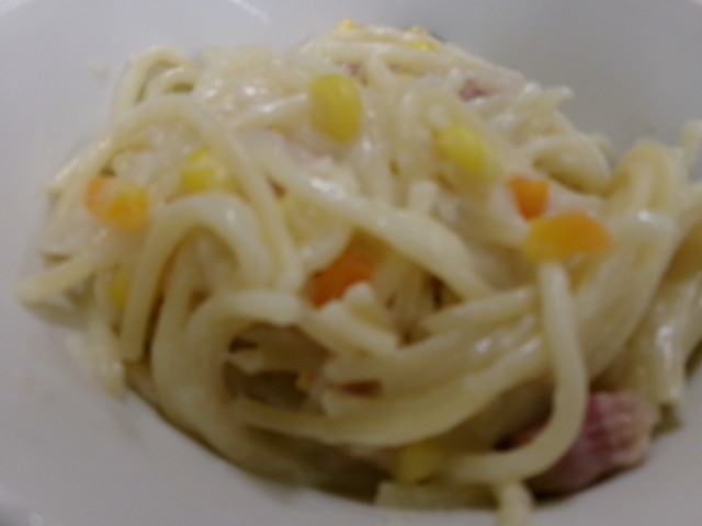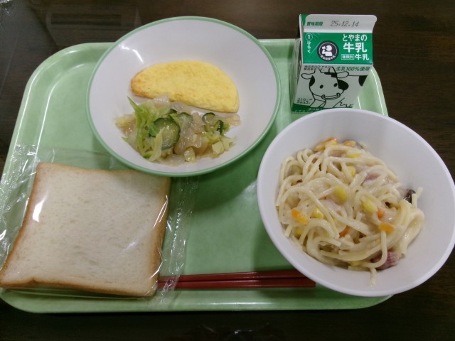今日は、クリームスパゲッティ!ホワイトソースがからみあって、とてもおいしいです。おかずがスパゲッティなので、今日の食パンは、減量パンで1枚になっています。