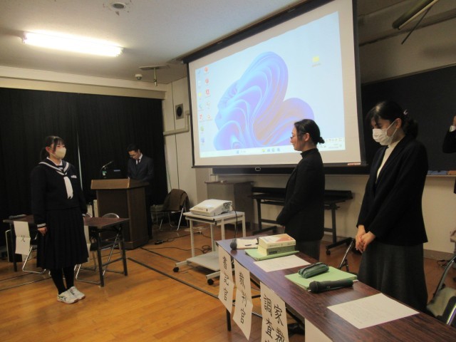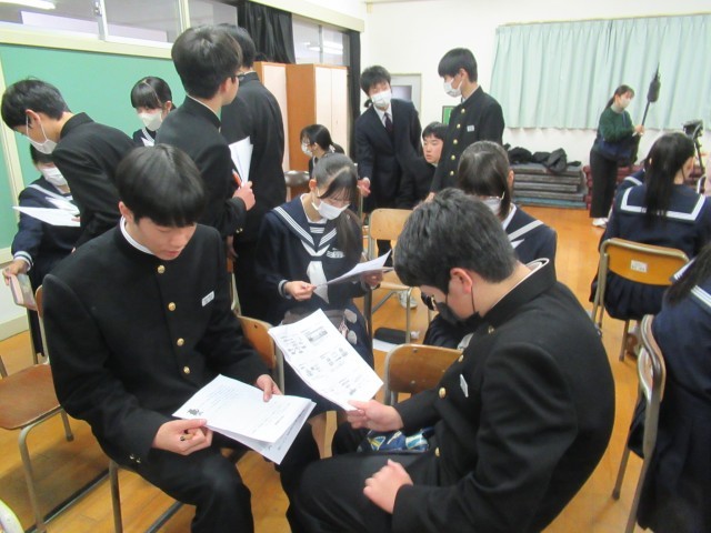本日5,6限に家庭裁判所の方をお招きし、少年審判の模擬裁判を行いました。学年生徒会のメンバーが両親や付添人の役をやり、実際の裁判を再現しました。その様子を見た後に、4人グループになり、少年にどういう審判を与えることがよいのかを話し合いました。それぞれに出た意見を聞いて、裁判官からのアドバイスをもらい、公民で学習した民事裁判や刑事裁判についても詳しいお話を聞きました。「本物」に触れたことで、自分の将来の仕事や生き方にプラスに繋げていきたいと思います。