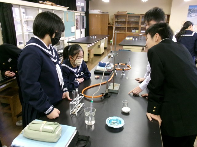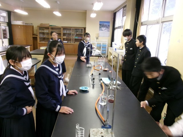 理科の授業の様子です。液体を加熱して沸騰させ、出てきた気体を冷やして再び液体として集めています。「蒸留」ですかね。赤色の液体を沸騰させたのに、集まった液体は、赤色ではありませんでした。どうしてかな?を知るのが面白いところです。