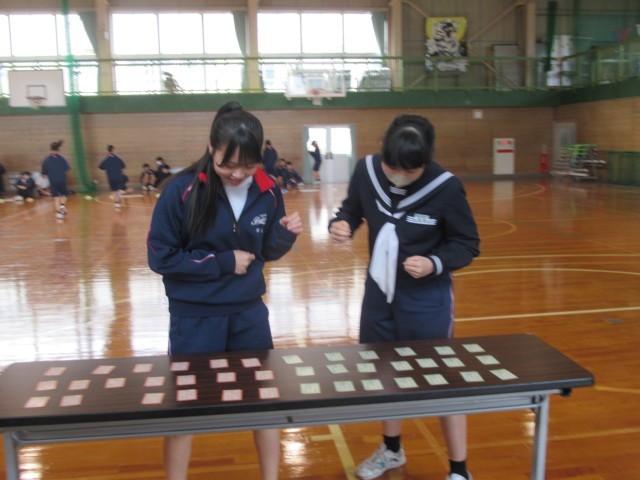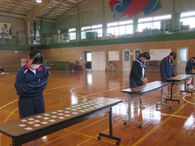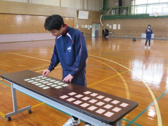 今日は3年生にとって、最後の学年レクリエーション「百人一首リレー」を行いました。上の句を聞いて、素早く取って走るチームもいれば、時間切れになっているチームもいました。企画・運営してくれた学年生徒会のみなさん、ありがとうございました!
