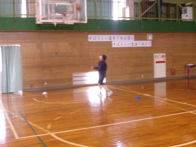 保健体育 バスケットボールの授業の様子です。3年生は、バスケットボールが今日からなので、ボールの感覚を確かめながらシュート練習をしていました。レイアップシュートは、得点率が高いシュートなので、マスターしてゲームでできるといいですね。