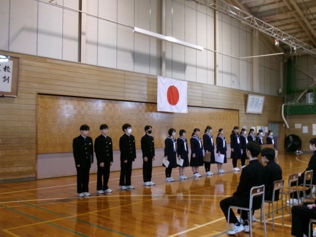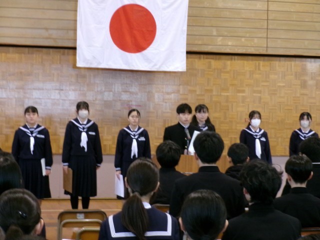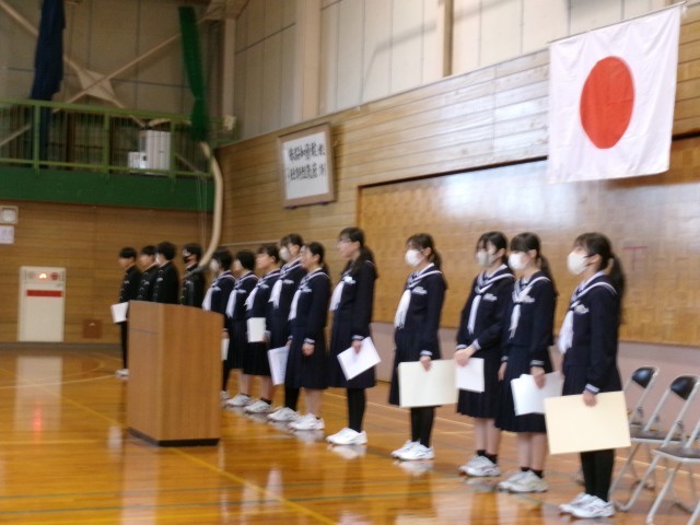 受賞報告会の様子です。部活動や応募作品で受賞した生徒たちが、結果報告と振り返りの一言を発表しました。前に出ている人のほかにも入賞した生徒たちもたくさんいます。本当によく頑張りました。この受賞を挑戦するきっかけや自信につなげていってください!おめでとうございます!