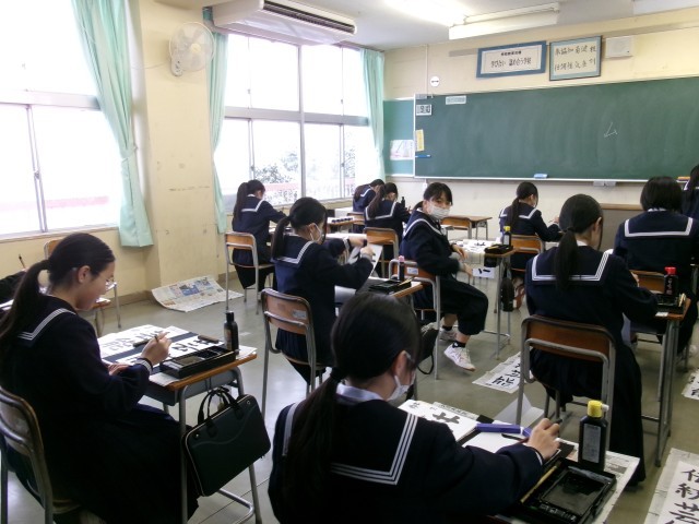 1月8日(木)書き初め大会(1学年) 公開日 2026/01/08 更新日 2026/01/08 学び合い認め合う学習 2つの教室を使って、伸び伸びと書いています。「難しい・・・」と言いながら、取り組んでいる生徒もいました。