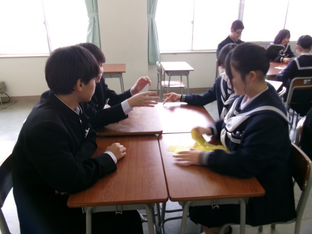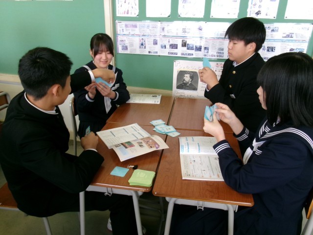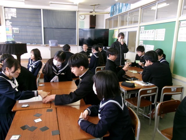 音楽の授業です。音楽記号や楽器等の読み方や意味とイラスト等を合わせる「音楽かるた」しているところでした。楽しく覚えることができそうです!笑顔がたくさんあるなか、勝負に負けて、とても悔しがっている人もいました。