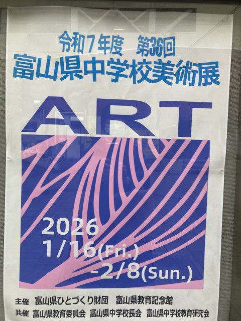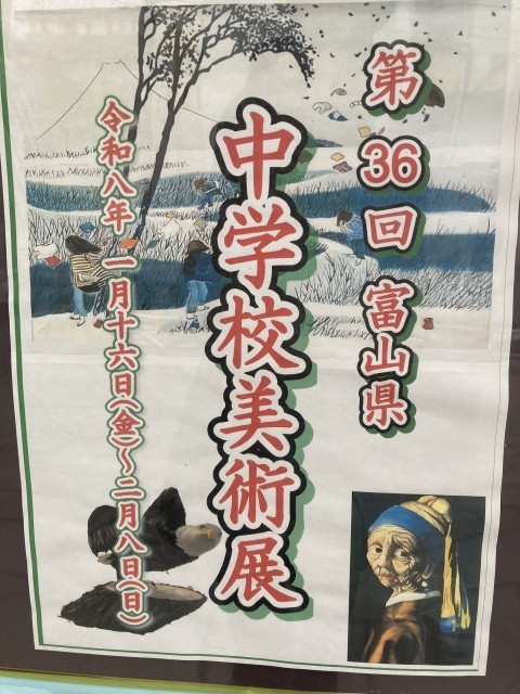 第36回富山県中学校美術展が富山県教育記念館で2月8日まで開かれています。月岡中生の作品も展示されています。県内の中学生の作品に触れるよい機会ですので、都合がつく方は見学してください。