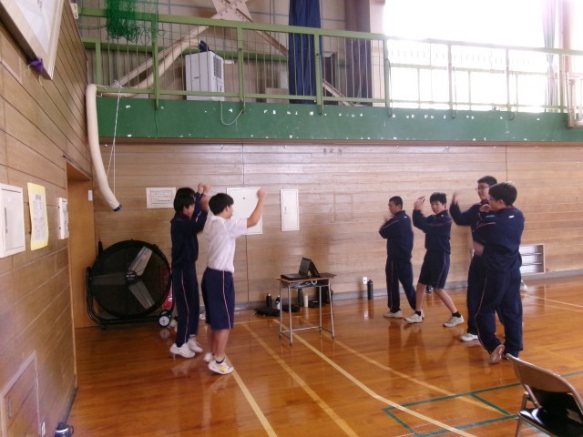 保健体育 ダンスの授業の様子です。まずは、真似て踊っているようです。思うように手足が動かないと言いながら頑張っている生徒もいました。とても楽しそうです。