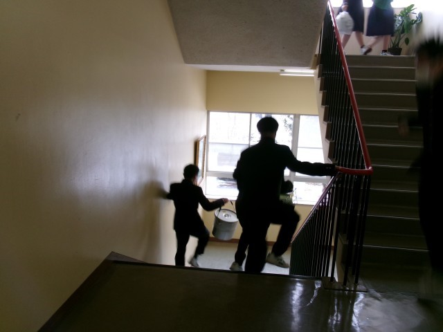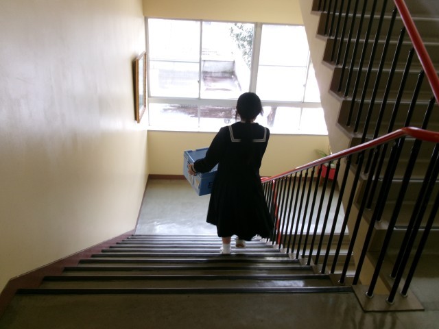 給食後、配膳室まで食器等を片づけに行く様子です。急いで階段を降りる人もいれば、語らいながら降りていく人もいます。
