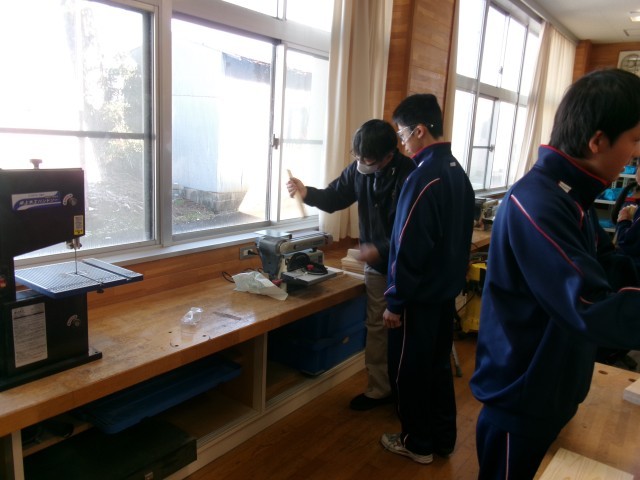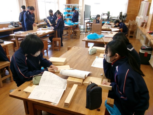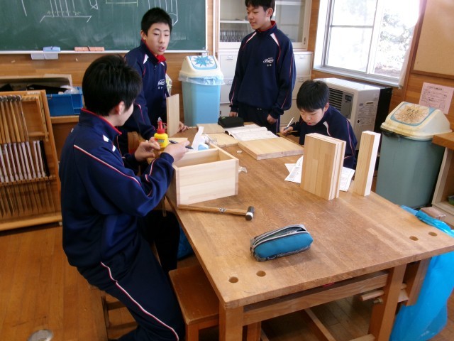技術・家庭科の技術分野の様子です。友達に聞いたり、自分で調べたりして木工製作が順調に進んでいるようです。自分の作品に愛着がわくことと思います。
