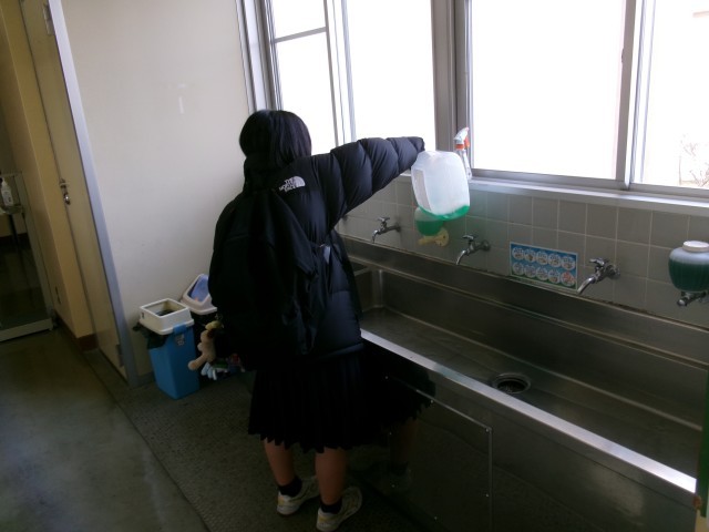 1枚目の写真は、代議員会の様子で。2枚目は、保健体育委員がせっけん液を補充しているところです。どの委員会も常時活動に加え、月ごとの行事活動を行っています。