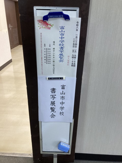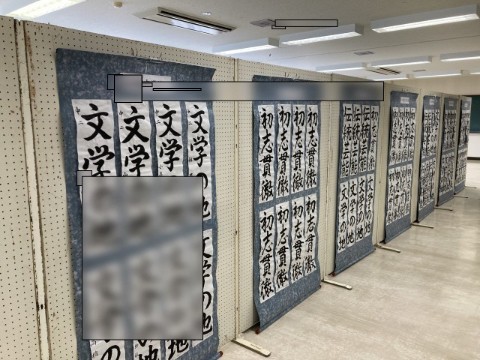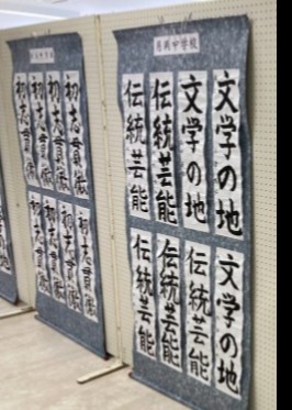 婦中ふれあい会館で開かれている書写展覧会の様子です。市内中学校の生徒作品が展示してあります。