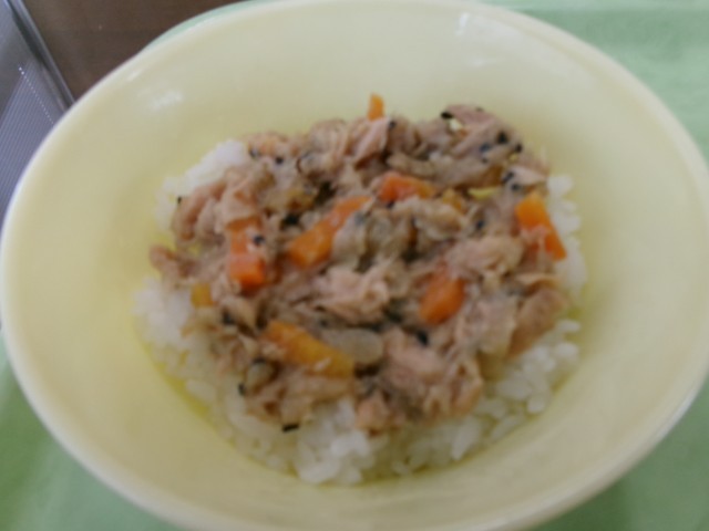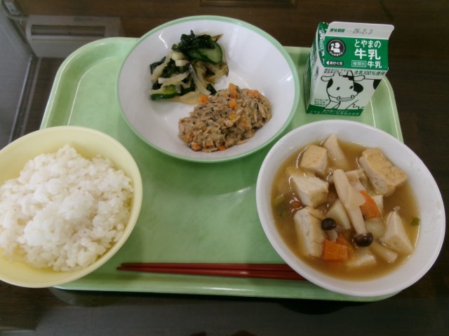 全国学校給食週間2日目、今日は「国語」です。スイミー丼は、スイミーを追う大きな魚を「まぐろ(ツナ)」スイミーを「黒ゴマ」仲間の赤い魚たちを「みじん切りの人参」で表現しています。海のサラダは、スイミーが暗い海の底で見た岩から生えている、昆布やわかめをイメージした海藻サラダ、かぶの煮物は「大きなかぶ」の物語を思い出してくださいとのことです。