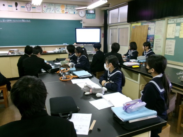 理科の授業の様子です。音の伝わり方についての学習にはいるところでした。「振動!」と答える声がありました。