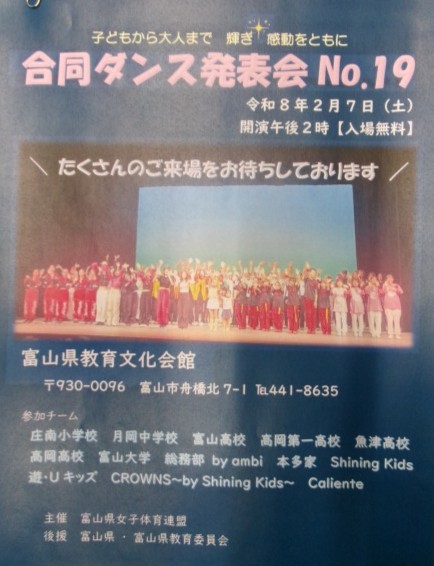 2月6日(金)合同ダンス発表会お知らせ 公開日 2026/02/06 更新日 2026/02/06 生徒の活動紹介 明日(2月7日)、富山県教育文化会館にて開催される合同ダンス発表会に月岡中学校 ダンス部が出演(15時頃)します。