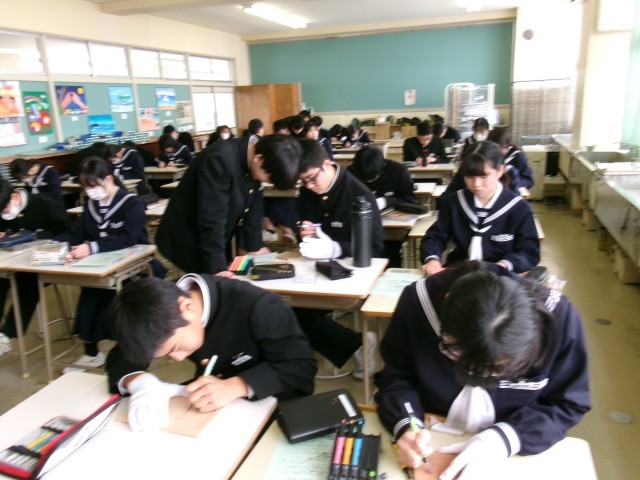 美術の授業の様子です。彫刻刀を使って、文字や図を彫っていました。まずは、彫り方の習得です。どの彫刻刀を使うのか、どう彫るのかなどを確認して挑戦していました。