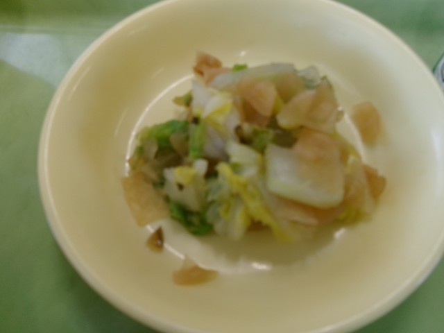 今日の「福神和え」は、福神漬けと白菜が和えてありました。いい塩梅で、美味しくいただくことができました。フルーツゼリーミックスのバナナの量も個人的には「いい塩梅」で、最高でした。