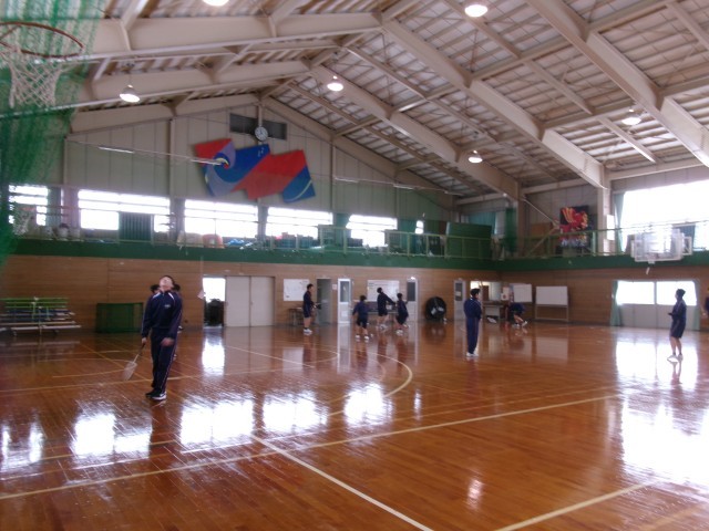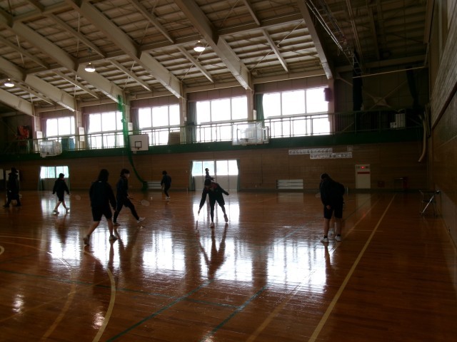 保健体育 バドミントンの授業の様子です。一人でフォアやバックでシャトルを打つ練習ですが、とても難しそうでした。