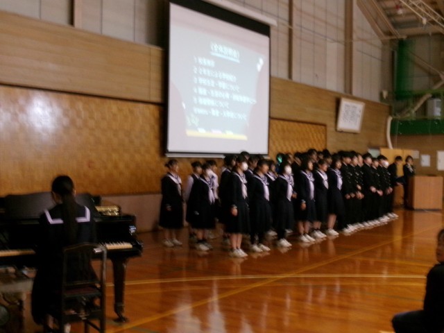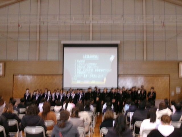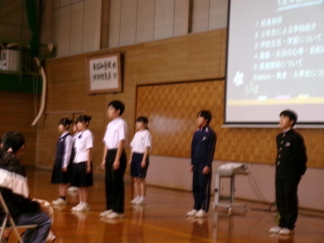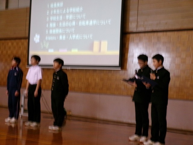 6年生のみなさんに、2年生みんなで校歌の紹介をしました。また、制服や体育服の紹介をファッションショー風に行いました。