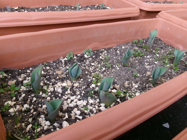 雪が溶けて、生活奉仕委員たちが植えたチューリップの球根から、芽が出てきました。