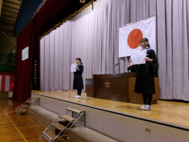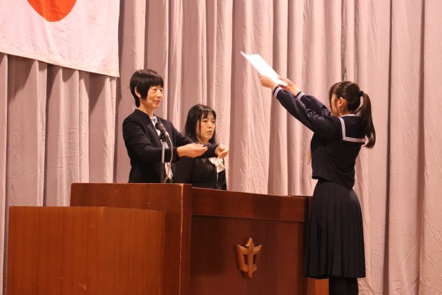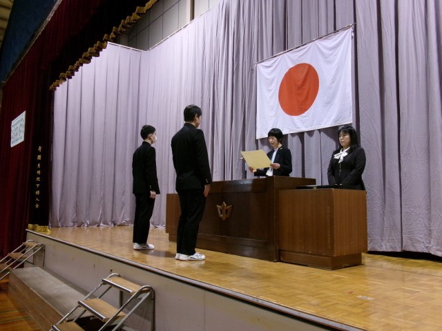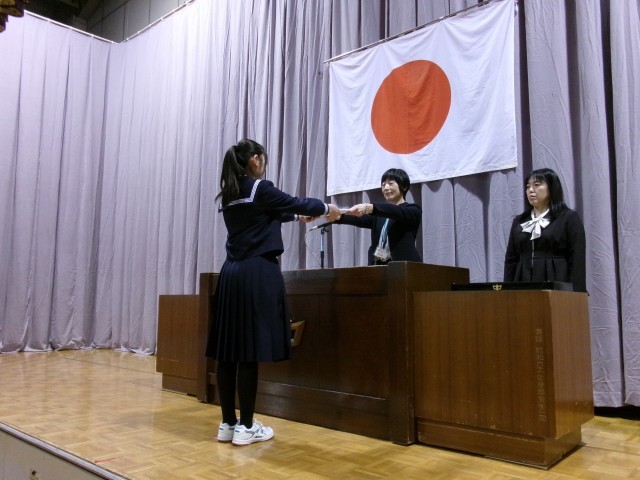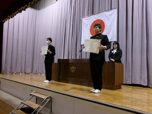 在学中に体育・スポーツの振興に貢献した人へ富山県中学校体育連盟スポーツ表彰が、文化、芸術、芸能の振興のために貢献した人へ富山県中学校文化表彰が授与されました。おめでとうございます!また、3年生の修了式として代表生徒に終了証を渡しました。