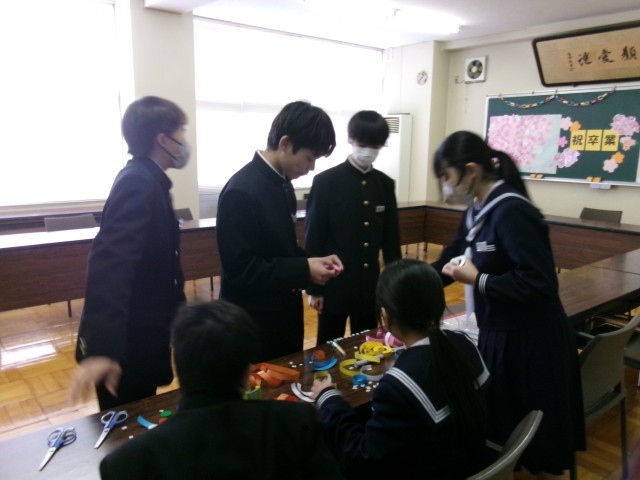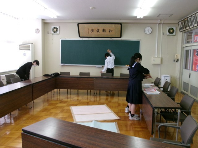 会議室の整備チームです。掃除をして飾り付けまで協力して頑張っています。3年生の教室も1年生が担当しました。明日、お楽しみに。
