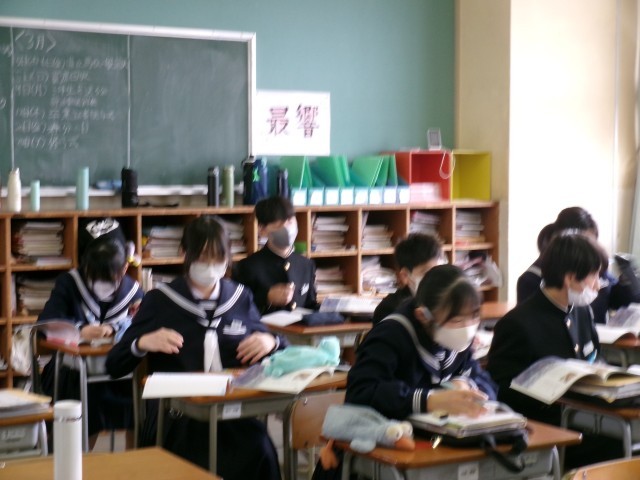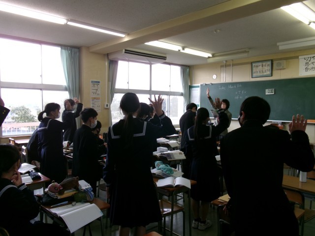 3月13日(金)授業の様子(1学年) 公開日 2026/03/13 更新日 2026/03/13 学び合い認め合う学習 英語の授業の様子です。「T or F」で挙手をして間違ったら「sit down」最後まで「standing」の人はご褒美獲得です。