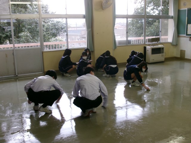 今日は教室のワックスがけの日です。写真は古いワックスを剥がす作業をしている様子です。