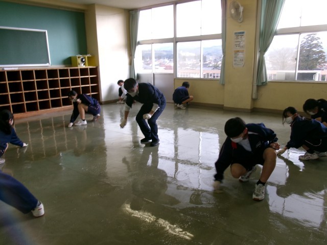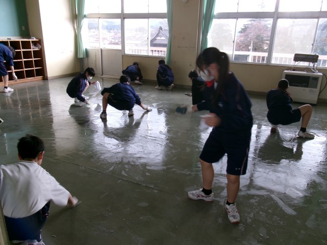 みんなで協力して床を綺麗にしてくれています。