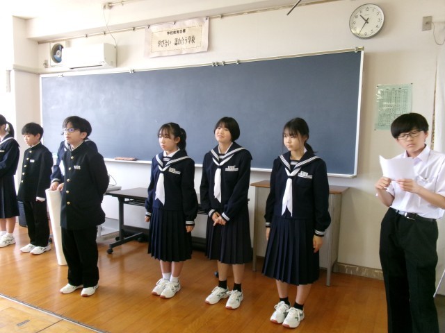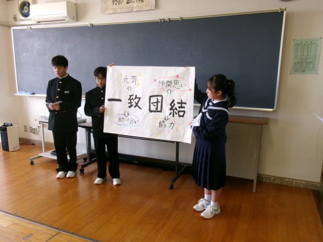 先週各クラスのリーダーが決まり、前期の学年生徒会のメンバーを紹介しました。1学年のスローガンは「一致団結」です。44人が協力し、助け合いながら、元気に活躍できる学年にしていきましょう。また、後半は体育大会についての話がありました。今年度は、グラウンド改修のため5月に行われます。昨年度の様子を写真で見ながら、いよいよ始まる体育大会に向けて、1年生も気合いをいれました。