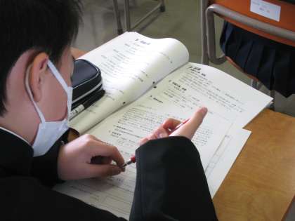 新入生のしおりを読みながら、中学校生活の1日について確認しています。教科によって担当の先生が違うなど小学校と少し違うところもありますが、基本は同じです。大丈夫!