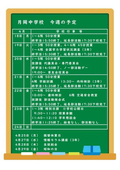 今週は生徒総会に向けた取組とともに、部活動発会式があり、いよいよ全校生徒が同じ目標に向かって新たなスタートを切ります。先輩・後輩が相互に高め合える素晴らしい活動を期待しています。頑張れ、月中生!