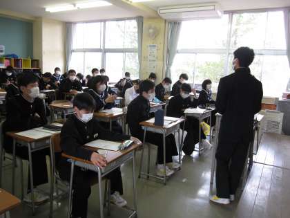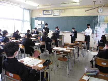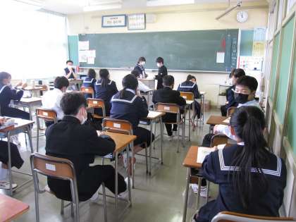 来週の生徒総会に向けて、各学級で学級討議が行われました。代議員や各委員が前期の生徒会活動についてクラスのみんなに説明をしています。