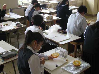 自宅から持ってきた果物や野菜を鉛筆でスケッチしています。このスケッチをもとに次の授業でデザイン化します。どんな作品ができるか楽しみです!