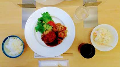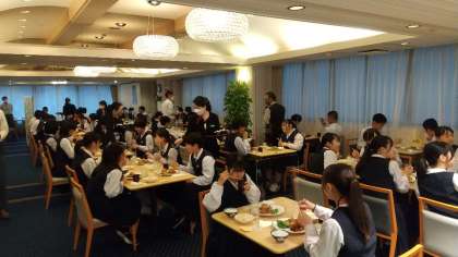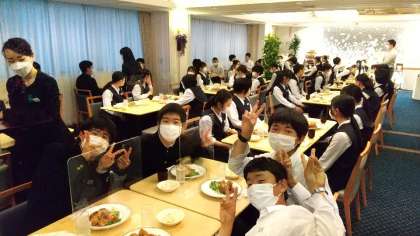修学旅行 ー夕食ー 公開日 2022/05/12 更新日 2022/05/12 学び合い認め合う学習 18時25分、5分前行動で夕食会場に集合です。ホテルでの最初の食事に高ぶる気持ちをおさえながら食事の開始時刻を待ちました。メニューは大きめのハンバーグ、鳥の唐揚げ、野菜サラダ、ポテトサラダ、ご飯、みそ汁。美味しいおかずに、ご飯をお代わりする生徒もたくさんいました。夕食後は、入浴、班長会議、班会議、消灯・就寝の予定です。