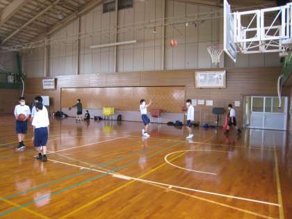 朝からはりきって練習しています。顧問の先生とコーチからシュートの打ち方を教わりました。ファイト!月中バスケ部!!