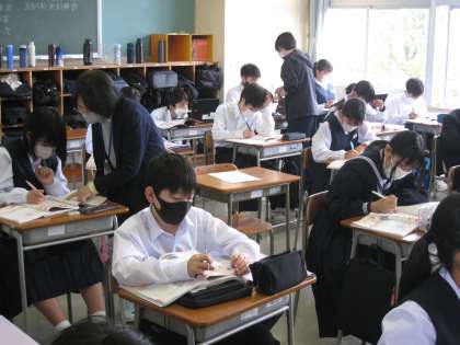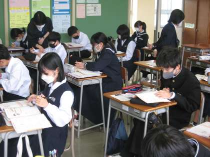 家庭科の授業風景です。中学生にとって必要な栄養にはどのようなものがあるか考えています。成長期のみんなには大事なことですね。