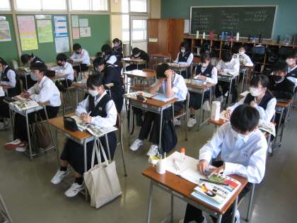 理科の授業風景です。葉(植物)のつくりについて学習しています。みんなノートをていねいに書いています。