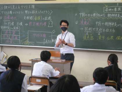 社会科の授業風景です。歴史の学習をしています。ヤマト王権時代と今の時代を比べてみるといろいろな違いや似ていることろがあります。