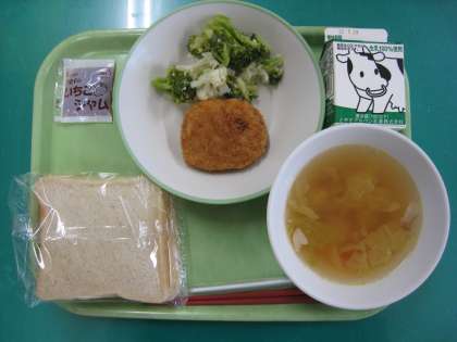 今日の給食 公開日 2022/05/23 更新日 2022/05/23 その他 5月23日(月) 今日の給食メニューは、 ・食パン ・牛乳 ・コロッケ ・花野菜サラダ ・ひよこ豆のスープ ・いちごジャム です。 コロッケはしっかりと味付けがしてあり、美味しかったです。