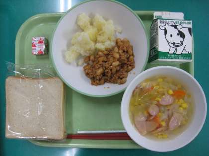 今日の給食 公開日 2022/06/06 更新日 2022/06/06 その他 6月6日(月) ・食パン ・牛乳 ・チリコンカン ・こふきいも ・キャベツスープ ・ポケットチーズ です。 チリコンカンは、ほどよい辛さでおいしかったです。