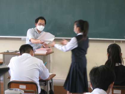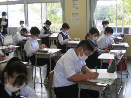 数学の授業風景です。先日行われた確認テストが返されました。返却後、しっかり見直しをしています。大事です!