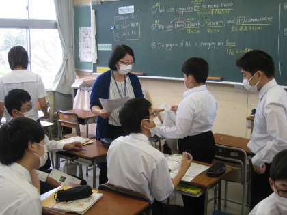 英語の授業風景です。「行動を英語で表す」という課題に取り組んでいます。少人数指導でそれぞれ分かれてがんばっています。