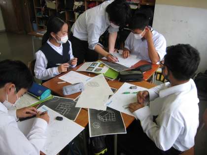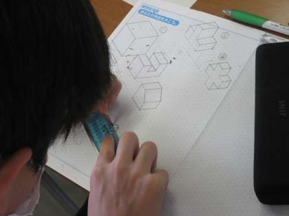 技術科の授業風景です。製図の練習をしています。この作図が今後、本棚等の製作に生かされます。みんな上手です!