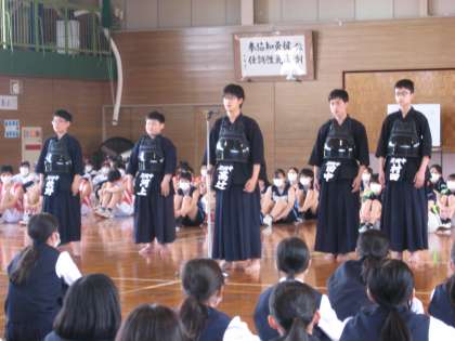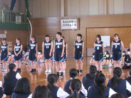 市総合選手権大会壮行会 その2 公開日 2022/06/15 更新日 2022/06/15 その他 6月15日(水) 5限 各部長が部を代表して大会に向けた目標や意気込みを語っています。「応援よろしくお願いします!!」 (写真上:剣道部 中:バドミントン部 下:女子バスケットボール部)