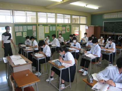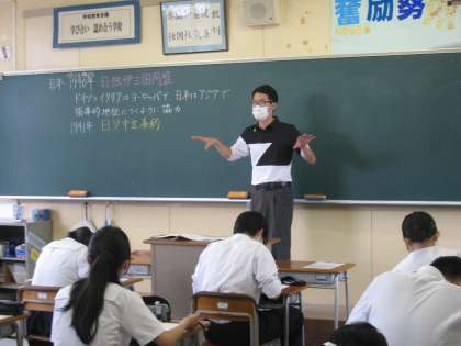 日本の歴史について 3−2社会 公開日 2022/06/16 更新日 2022/06/16 学び合い認め合う学習 6月16日(木) 4限 3−2社会の授業風景です。日本の歴史について学習しています。先生の熱心な解説に生徒も引き込まれていました!