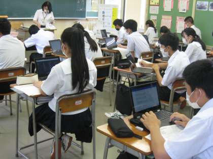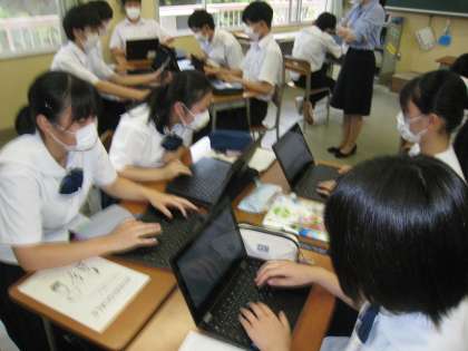 総合的な学習の時間に、SDGs(平和学習)について探究活動を行っています。それぞれが真剣に考えたり、意見交換をしたりしています。(写真上:3−1 下:3−2)