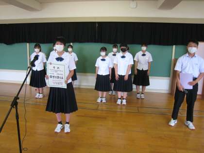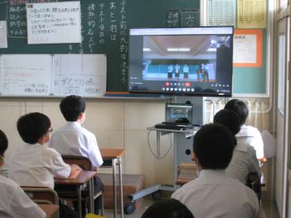 運動部等大会の受賞報告会(オンライン) 公開日 2022/06/28 更新日 2022/06/28 部活動 6月28日(火) 4限 先日行われた市総合選手権大会等で活躍したチームや選手がリモートで受賞報告会を行いました。校長先生からは「地域の方々も喜んでおられた。この後の県大会でも大いに活躍してください。応援しています」とのお言葉をいただきました。 (報告した部等:女子バスケットボール部、水泳部、硬式テニスクラブ)