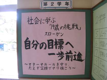 14歳の挑戦スタート 2学年 公開日 2022/07/05 更新日 2022/07/05 その他 7月5日(火) 本日より2年生「14歳の挑戦」がスタートします。「自分の目標へ一歩前進」という目標のもと、3日間がんばります!お世話になる事業所の皆様、保護者ボランティアの皆様、どうぞよろしくお願いいたします。