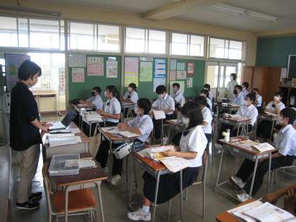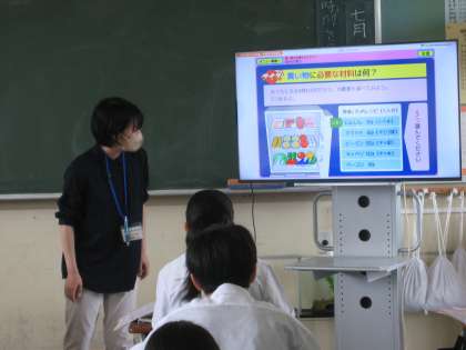 1−1家庭科の授業風景です。いろいろ情報をもとに正しい食品の選び方について学習しています。毎日の身近なことで、とても大切ですね。