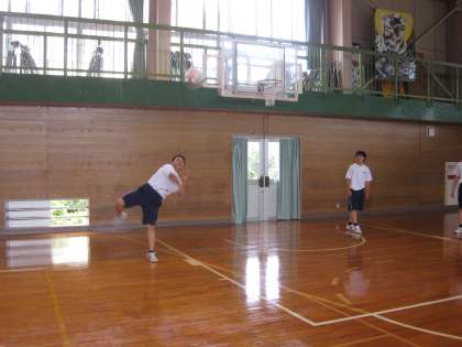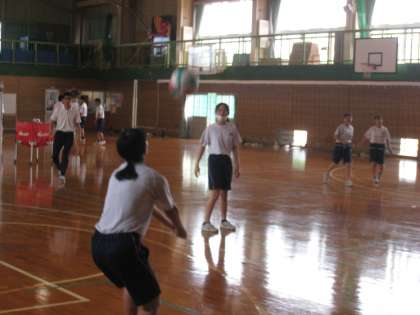 3−1体育の授業風景です。バレーボールの試合をしています。みんなとても楽しそうです!